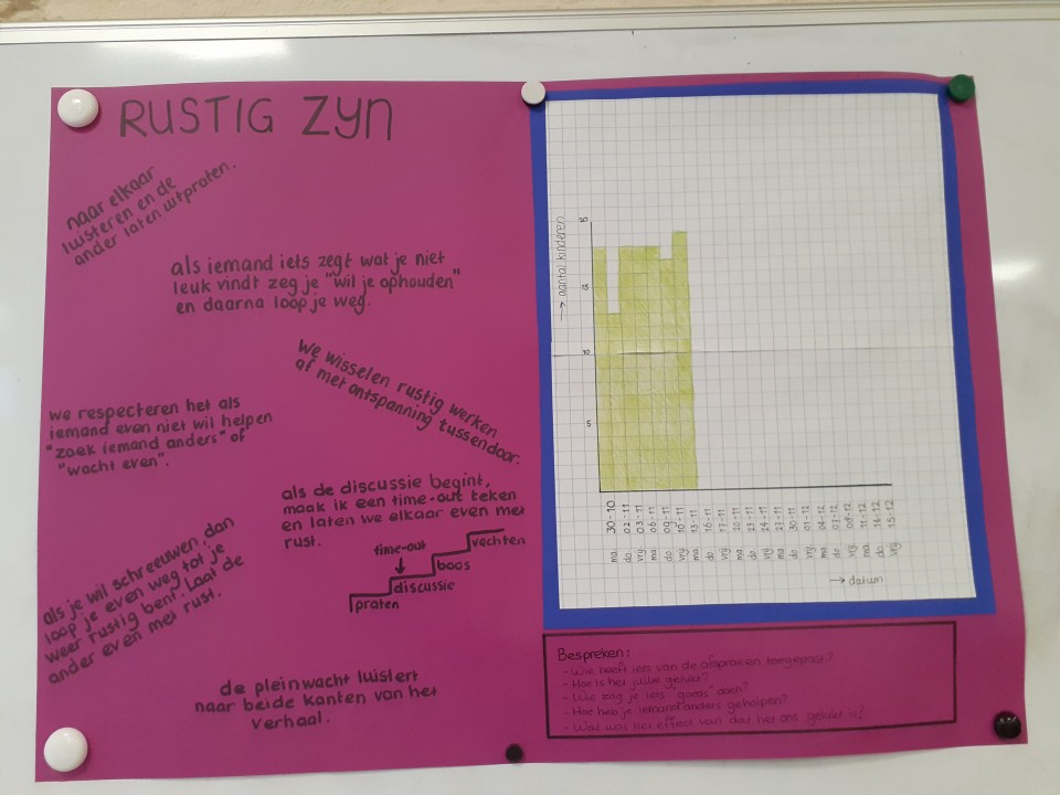 Als de kinderen alle goede redenen hebben genoemd gaan we aan de slag met een regel waarmee we de komende zes weken gaan oefenen. Omdat de regel altijd positief geformuleerd moet worden bedenken we de regel: We doen rustig. Om de regel heen beschrijven we alles wat kan helpen om rustig te blijven. Dat is makkelijker als je de goede reden kent van je boosheid en onrust. De kinderen bedenken: naar elkaar luisteren, elkaar laten uitspreken, respecteren als iemand even met rust gelaten wil worden, een time-out vragen als je in een gesprek begint met discussiëren en een time-in als je weer mee wil doen.