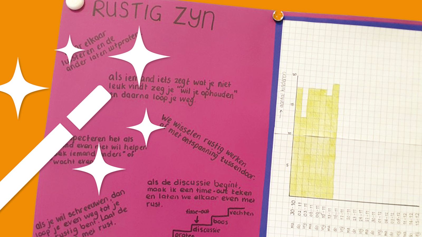 De leerkracht maakt een prachtige poster met de regel erop en ze spreekt af om drie keer per week te gaan oefenen. Ze tellen dan hoeveel kinderen rustig zijn geweest tijdens het buiten spelen of de gymles. Dat wordt bijgehouden in een grafiek. Na drie weken kom ik weer om te zien hoe het gaat. Alles is precies bijgehouden. Als ik in gesprek ga met de groep vertellen ze enthousiast hoe goed het is gegaan. Hoe vaak het is gelukt om iets toe te passen van de poster en dat het ze blij maakt omdat het nu veel gezelliger is op het plein en in de klas. Het time-out teken schijnt bijzonder goed te werken. ‘Ons geheime teken’ glundert een van de leerlingen. Ook de leerkracht kijkt trost naar haar klas. Wat een groei hebben ze in die paar weken doorgemaakt.